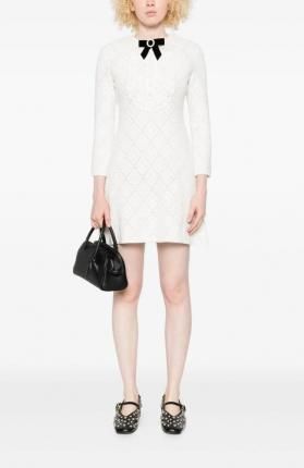 透かし編みがポイントのニットドレス。ホワイトニットにブラックのワンポイントがキュート♡