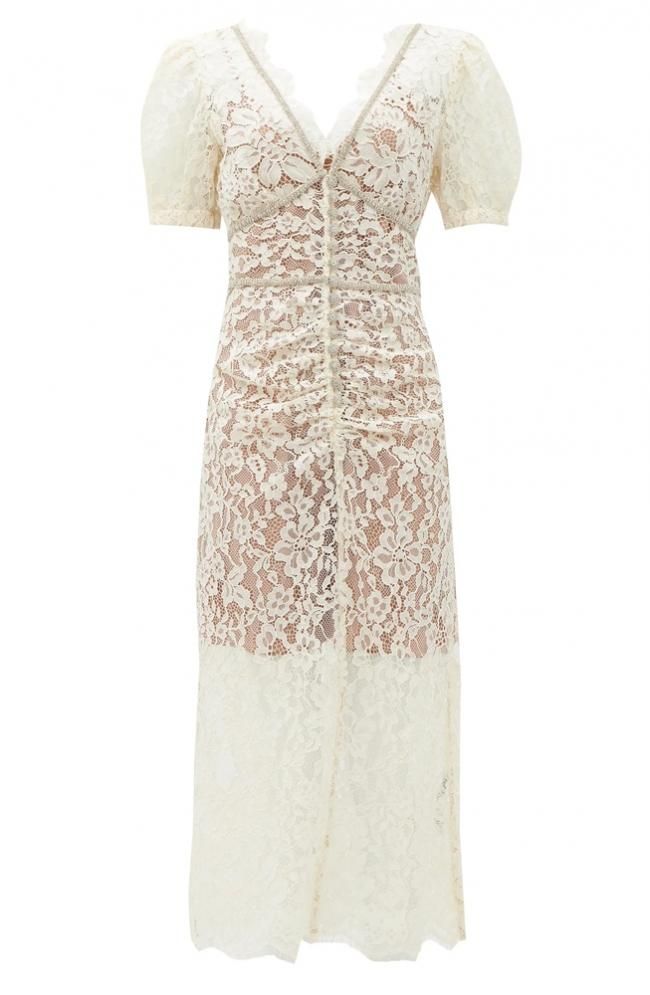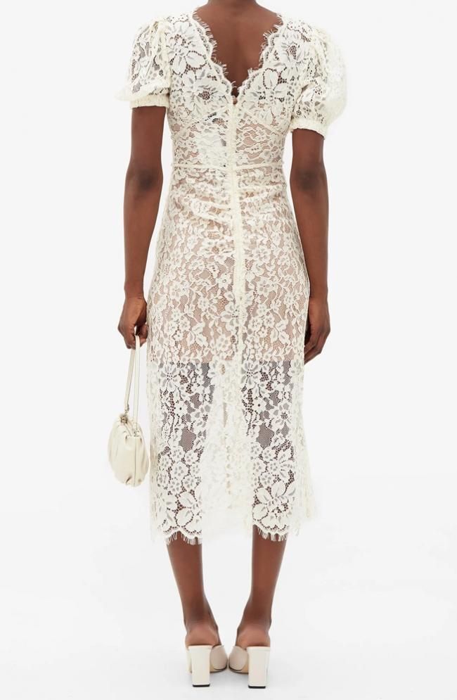 ギピュールレース クリスタル パフスリーブ ミディドレス アイボリー 白
