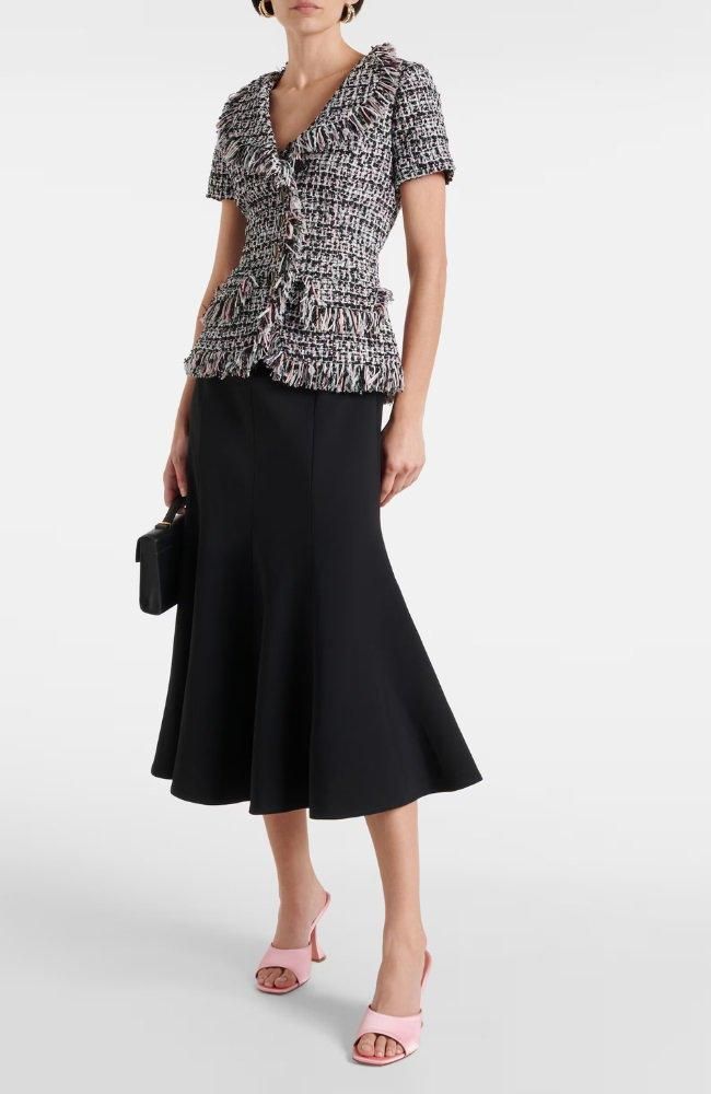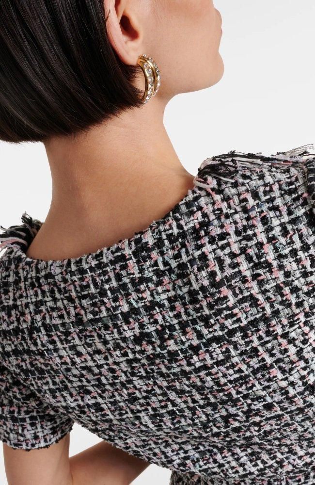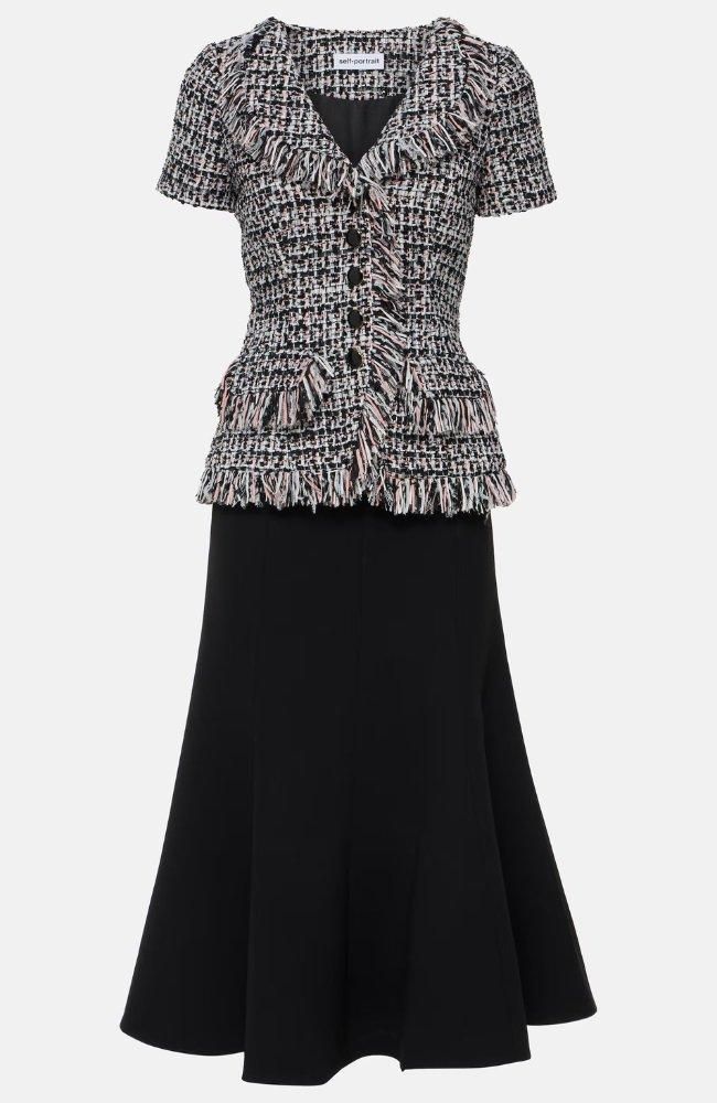 ピンクが織り込まれたツイード素材がポイント♪ この1着だけでおしゃれ見えするミディドレスです。 ジャケット風のトップスに、Aラインスカート上品に揺れるミディドレス。 表情のあるツイード素材とのコントラストが魅力的で、 1着だけで着映えし、タイムレスに着られるドレスです♪ トップス部分はジャケットディテールで、フェミニンさを感じるラウンドカラー。 ブラックにホワイト、ピンクが織り込まれたツイード素材は上品さがあり、 アクセサリーが控えめでも顔周りを華やかにしてくれます♪ スカート部分はマットな質感と柔らかさが特徴のクレープ素材。 8枚はぎという技法を用いられたスカートは揺れ方が優雅で、 大人の女性の上品さ、かつさりげない可愛らしさを演出♡ 1着でとても華やかなドレスですが、 ベースはタイムレスなモノトーンなので、あらゆるカラーと相性抜群◎ シーンやなりたい印象に合わせてスタイリングしてください♪ セレブに愛される”セルフポートレイト ” 女性らしさ溢れるモードフェミニンな世界をお楽しみください。