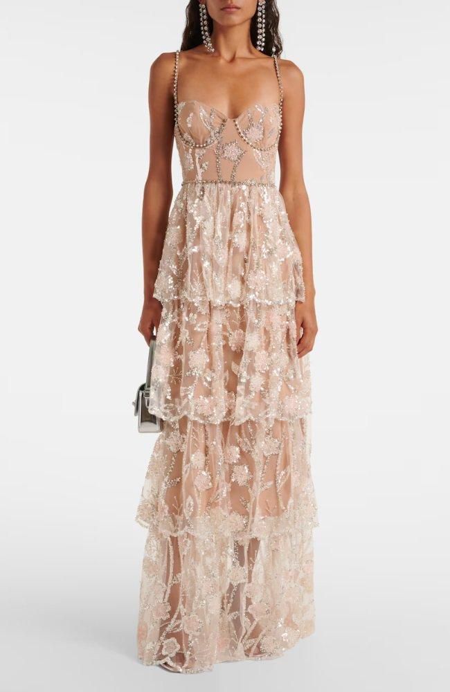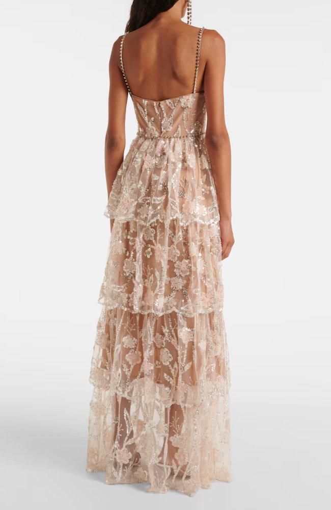 花のモチーフに施されたシルバーのスパンコールが美しいマキシドレス。