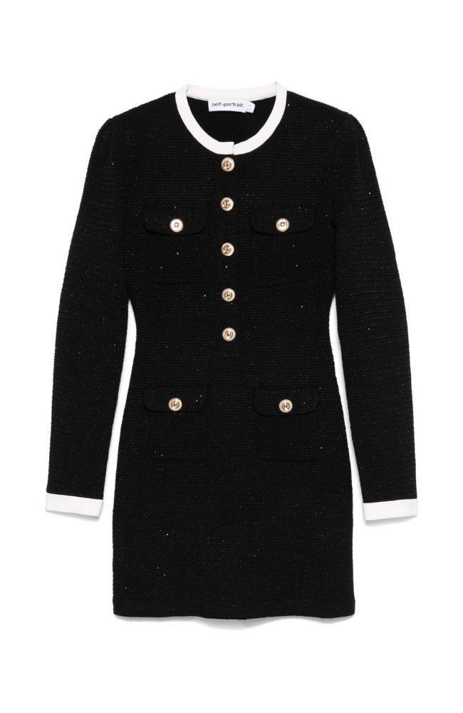 ホワイトトリムやゴールドボタンがラグジュアリーさを引き立てるニットドレス。