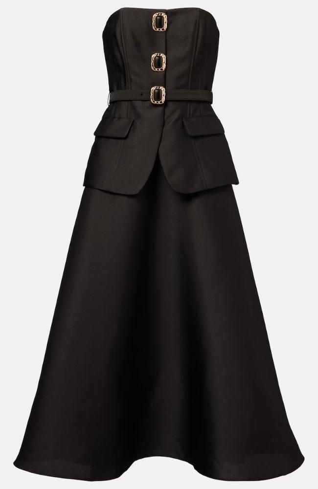 ストラップレス ジュエルボタン フレア ミディドレス ブラック 黒