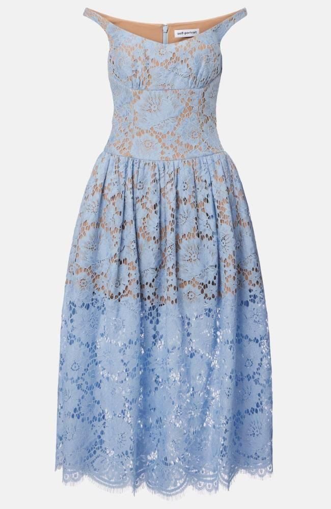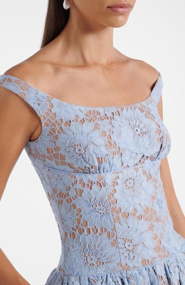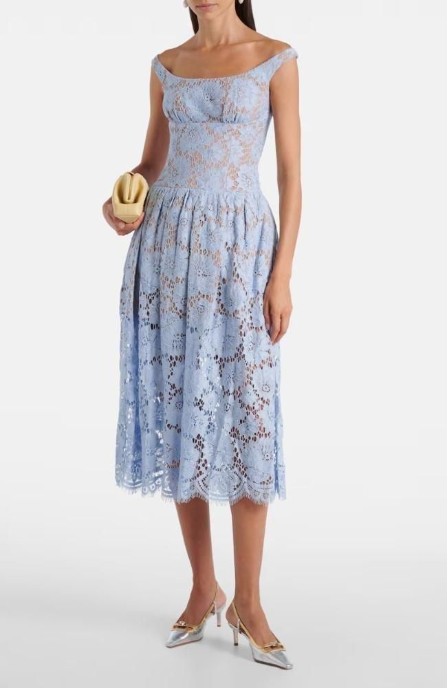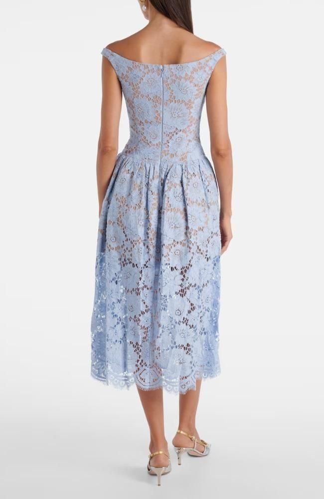 フローラルレース ギャザー フレア ミディドレス ライトブルー 水色 青
