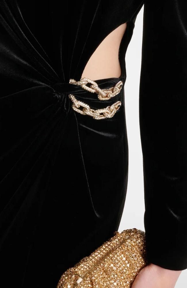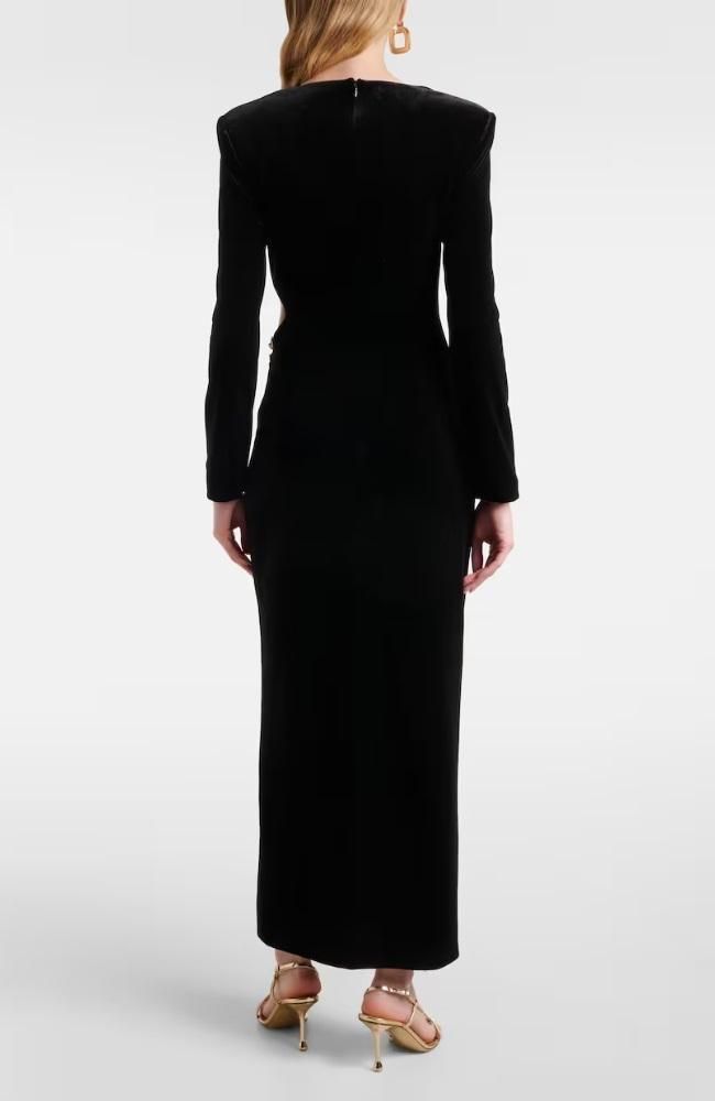 ゴールドチェーン ベルベット ロングスリーブ タイト マキシドレス ブラック 黒