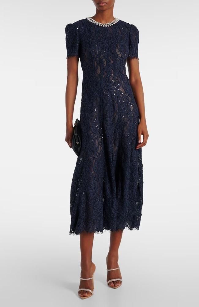 【SALE】フローラルレース ラウンドネック クリスタルトリム ミディドレス ネイビー 紺