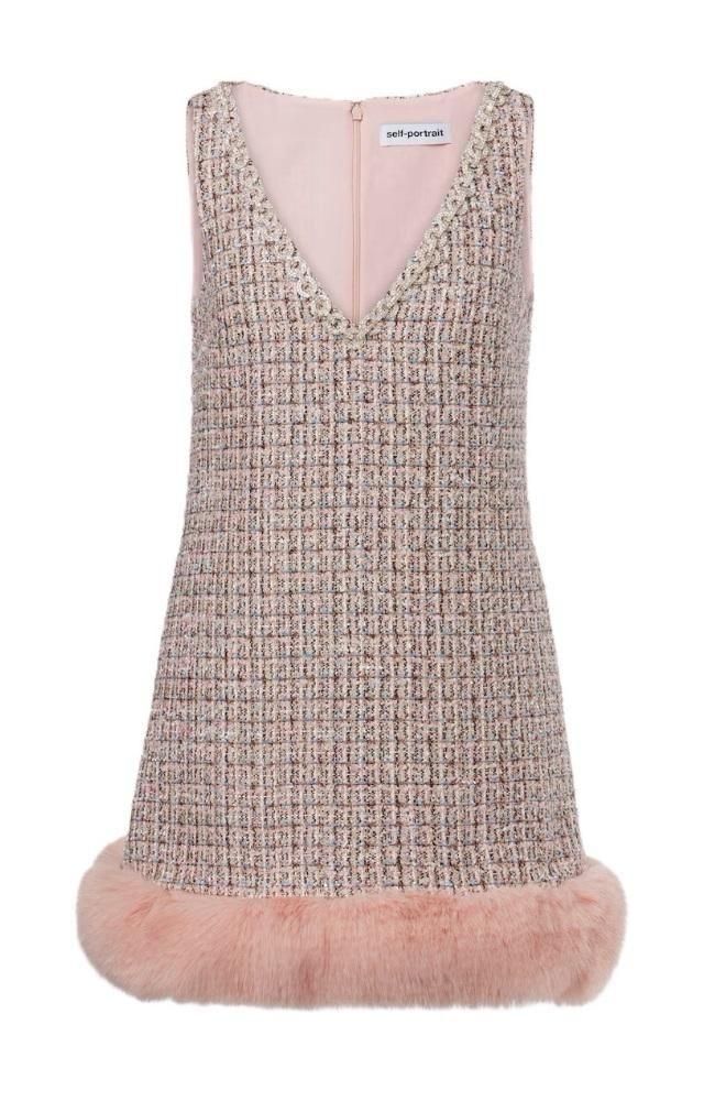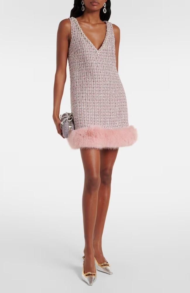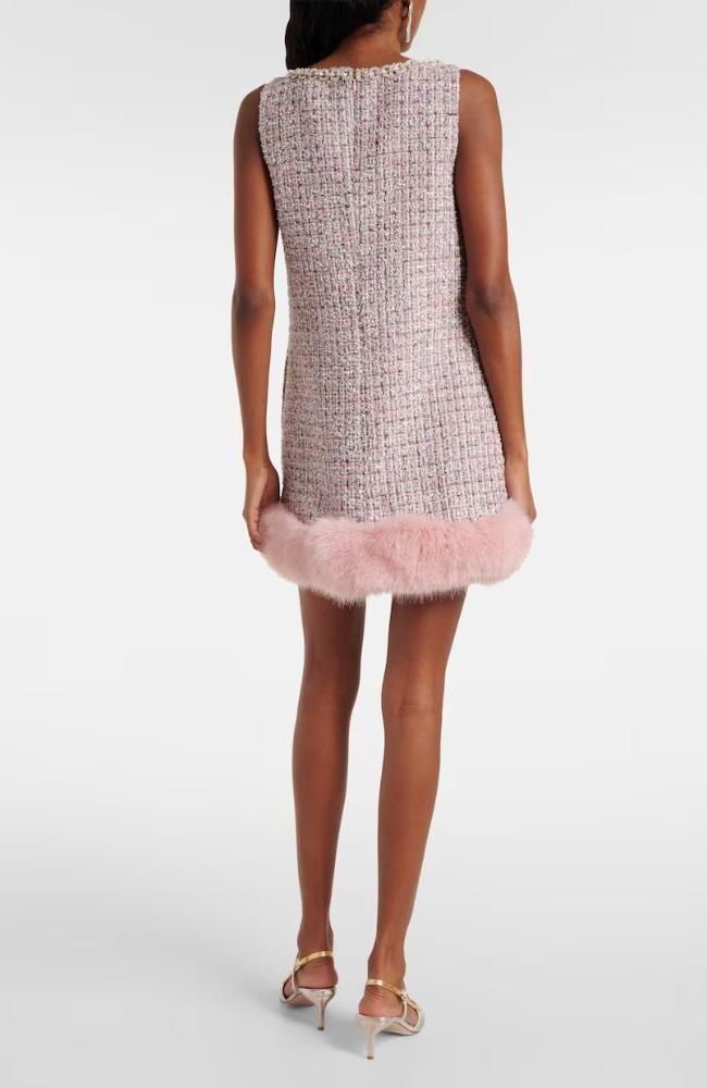 上質なブークレー素材にふわりとしたピンクファーを裾にあしらったミニドレス。