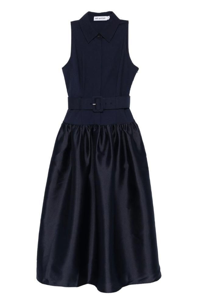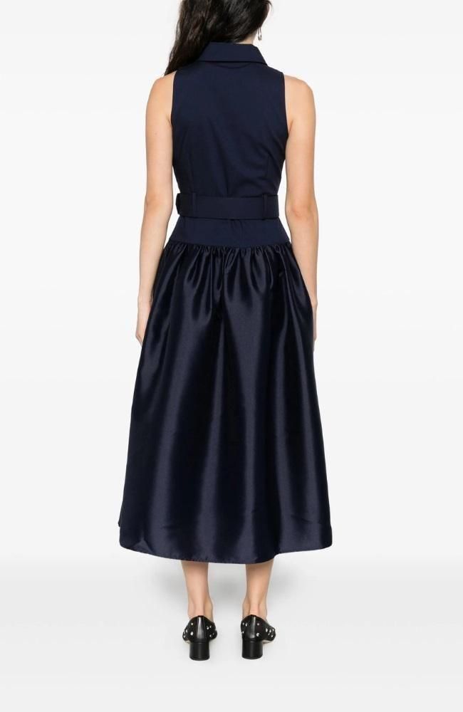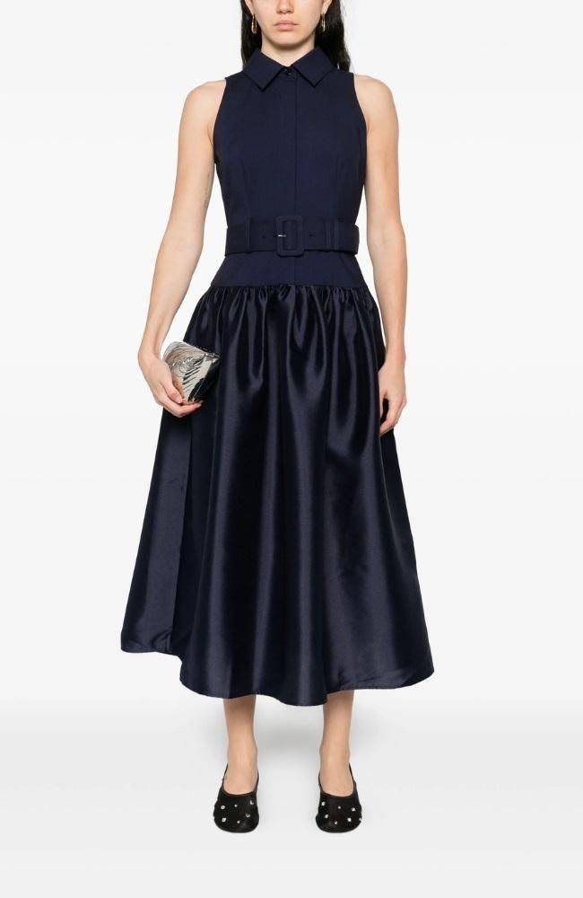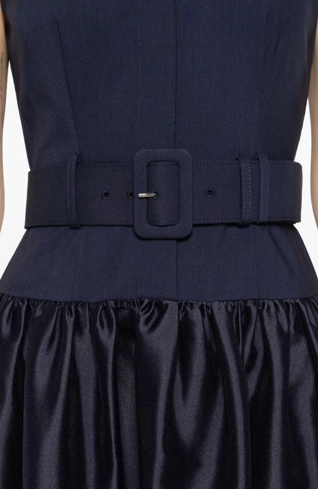 サテン調 ベルト付 ノースリーブ フレア ミディドレス ネイビー 紺