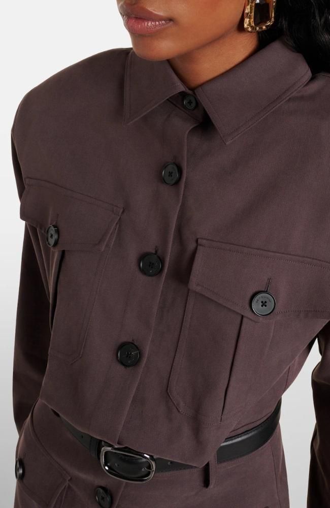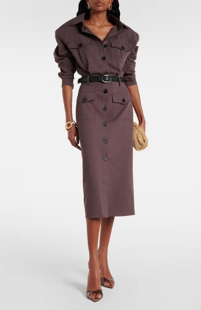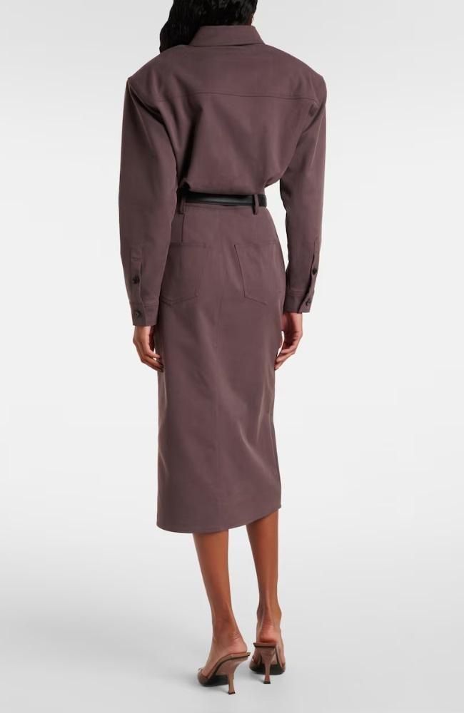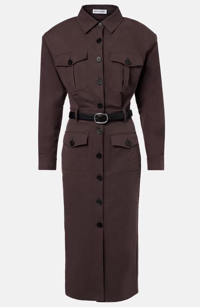 オーバーショルダー シャツディテール ベルト付 ミディドレス ブラウン 茶色
