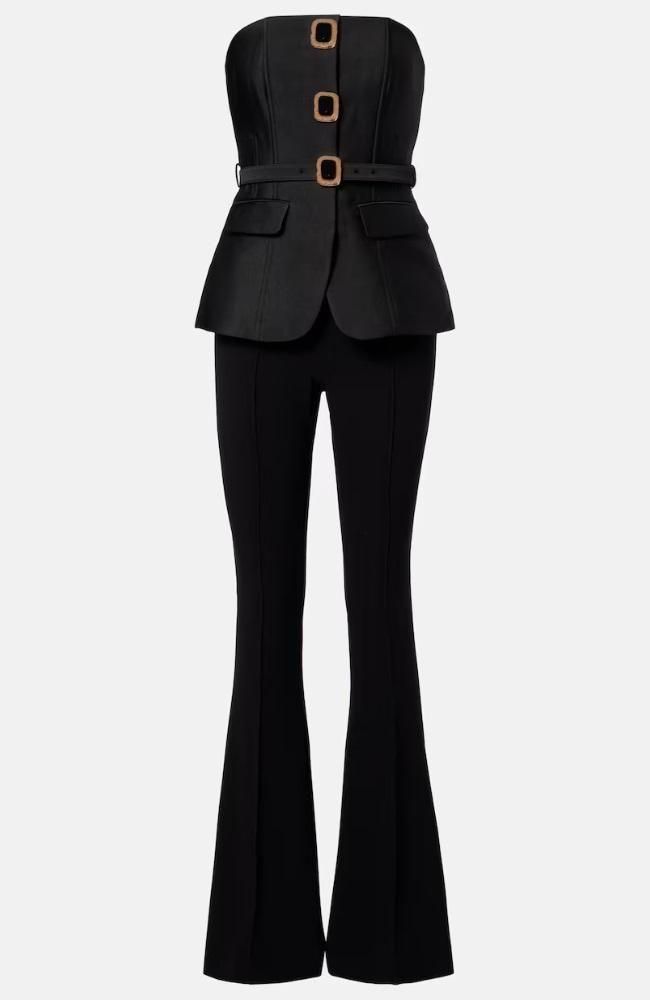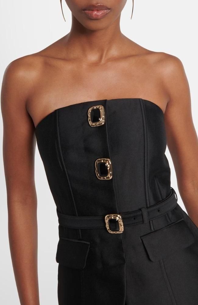 ストラップレス ジュエルボタン フレアヘム ジャンプスーツ ブラック 黒