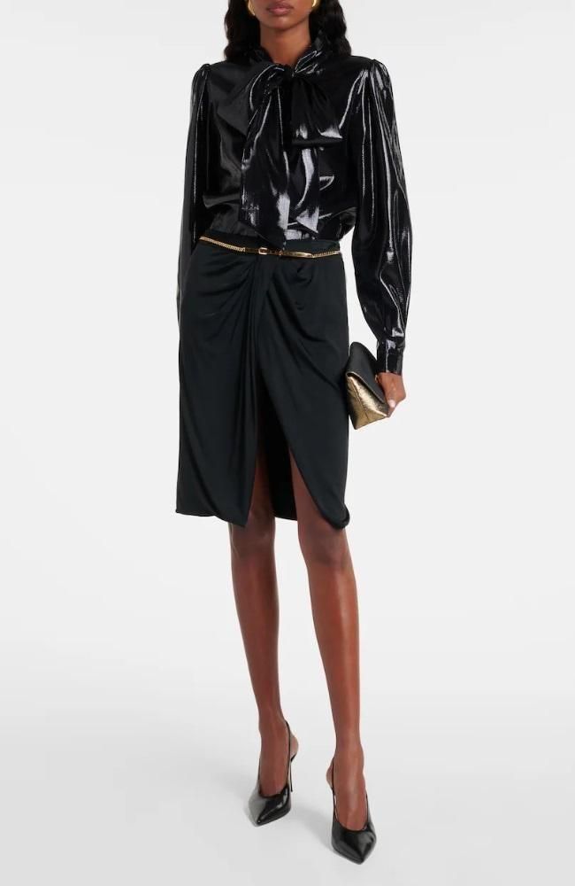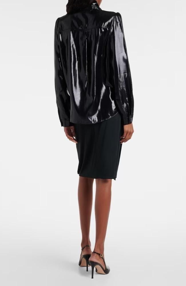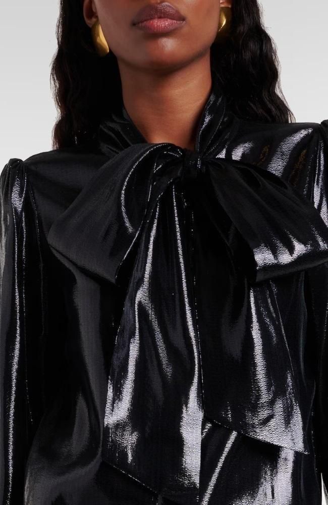 フェミニンなボウタイブラウスを、メタリック加工でシャープにエッジを効かせたブラウス。
