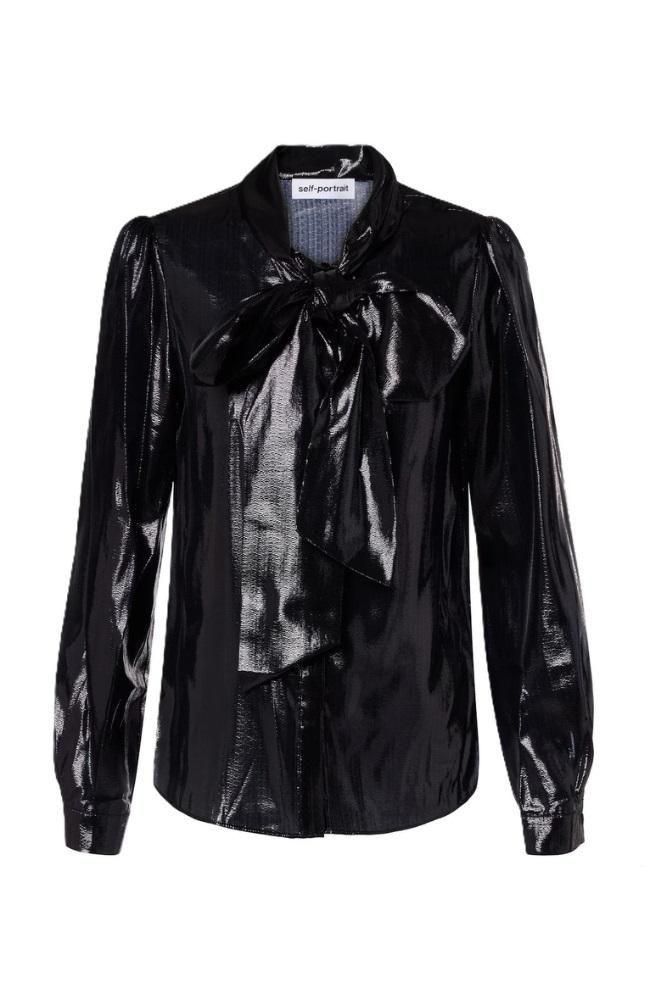 ボウタイ メタリック加工 ロングスリーブ ブラウス ブラック 黒
