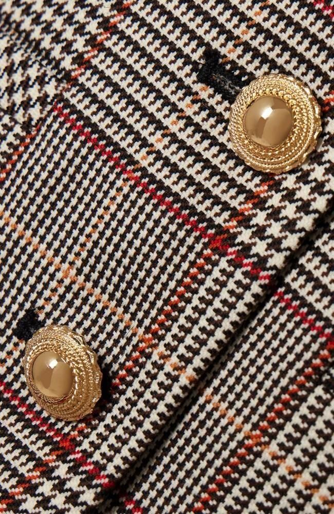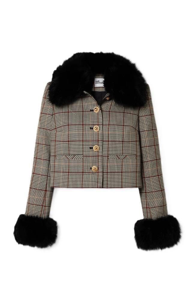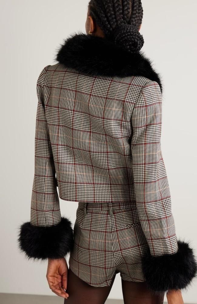 チェック柄 ウール混 プラッシュトリム ジャケット ブラウン 茶色