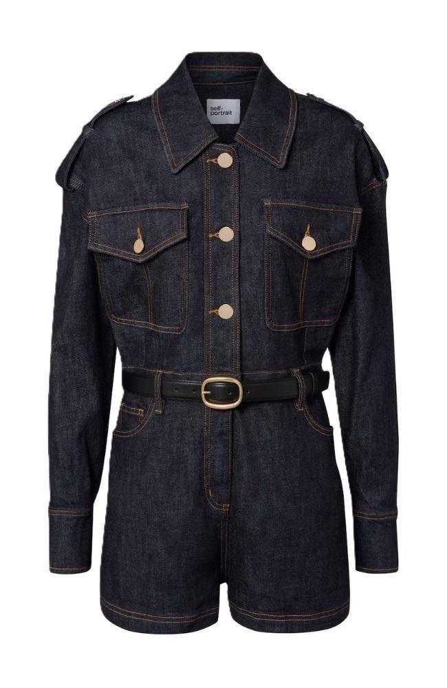 デニム ドロップショルダー レザーベルト ロンパース インディゴブルー 紺