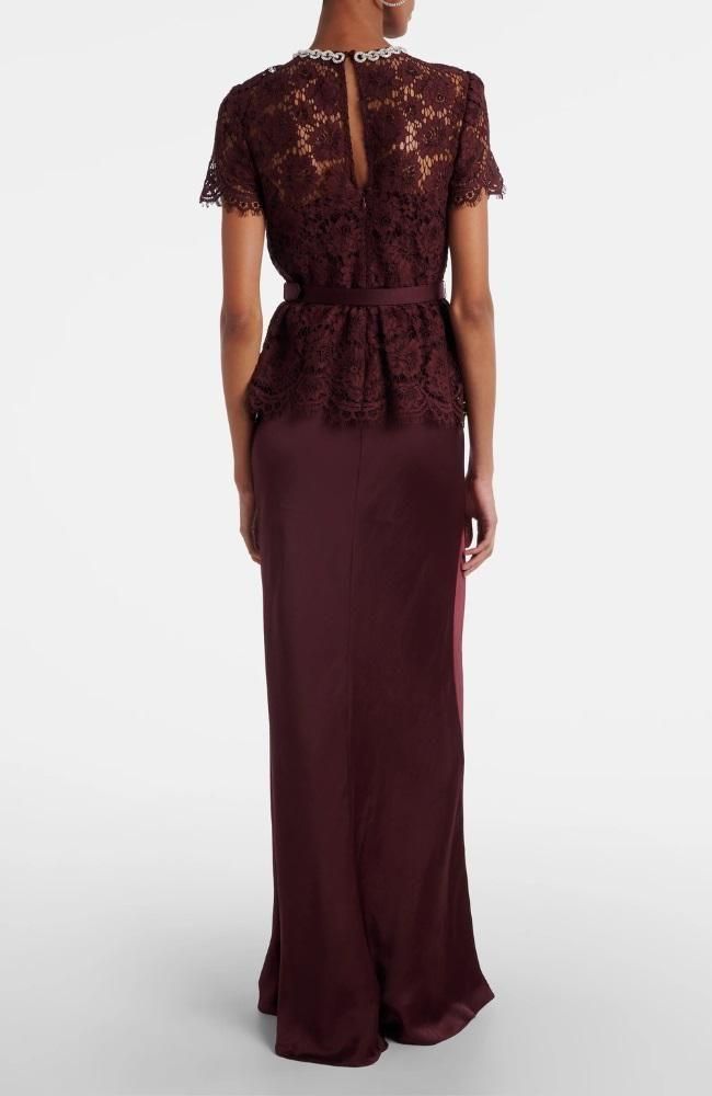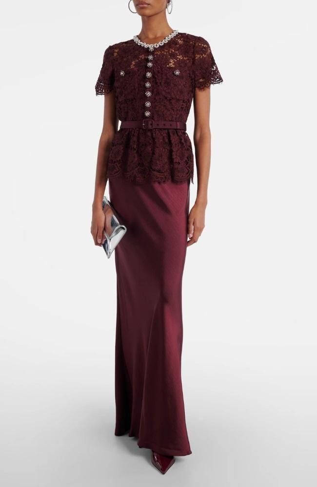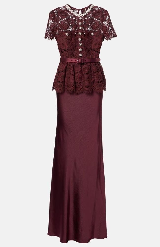 レース サテン クリスタルトリム ロングドレス バーガンディ レッド 赤