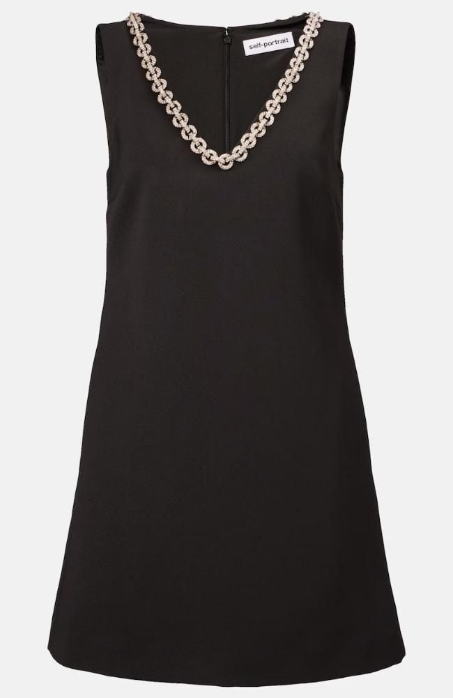 クリスタルチェーンが華やかなミニドレス。
