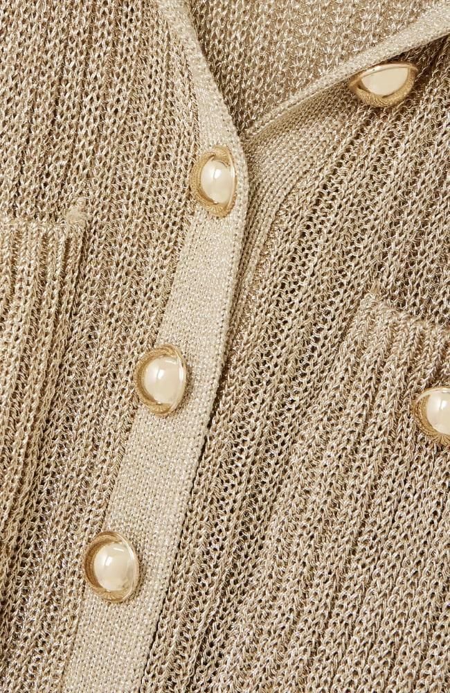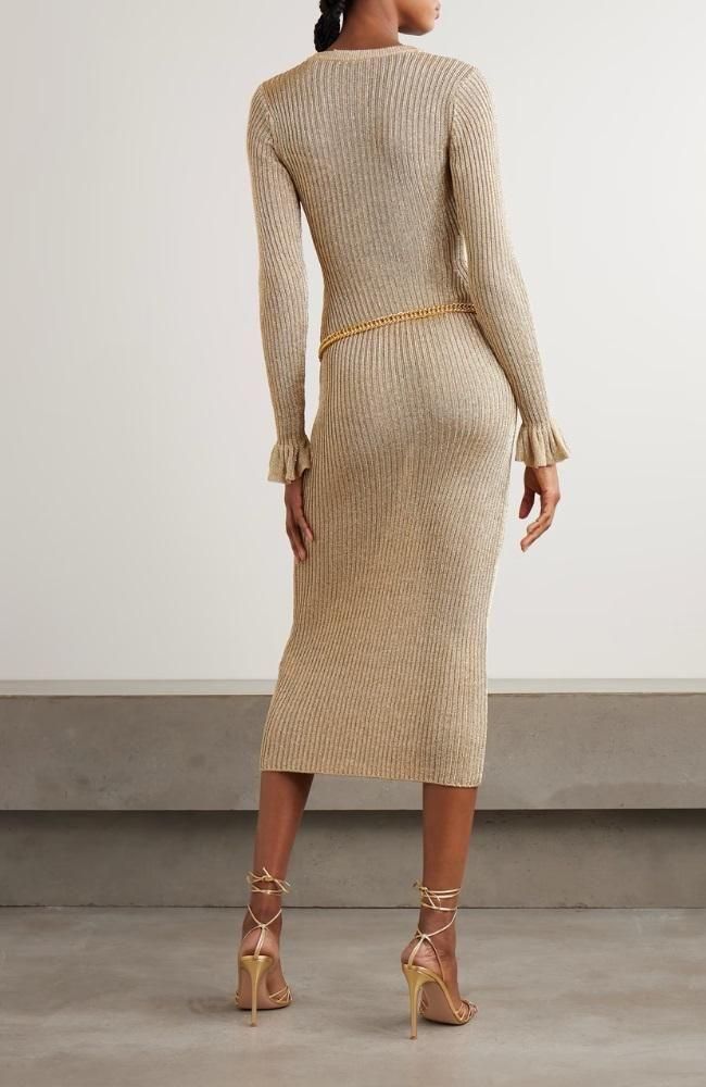 メタリック リブニット フリルスリーブ ミディドレス ゴールド ベージュ
